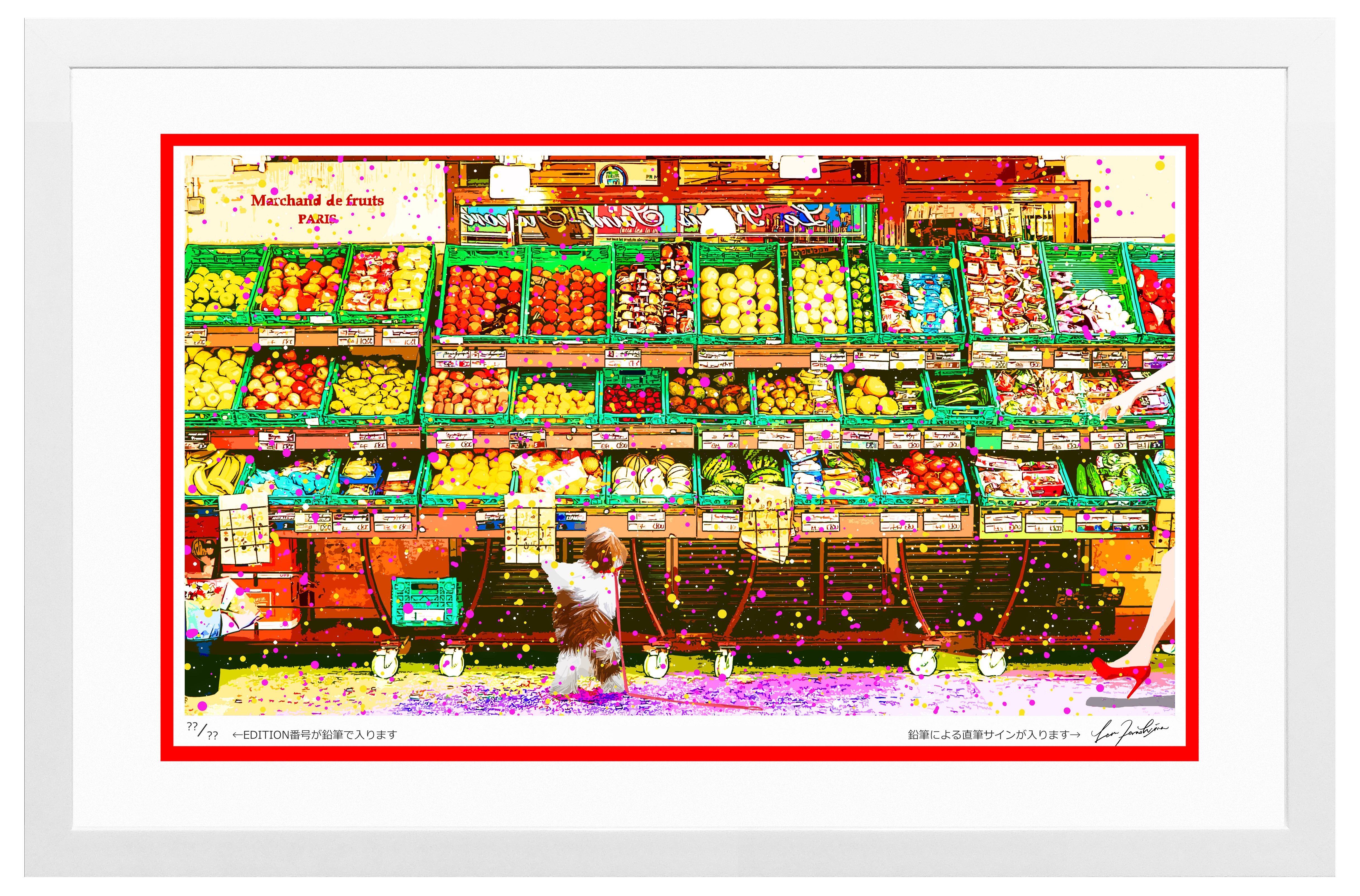 パリの小さなスーパーの表では、フルーツがたくさん売られています。散歩中の一匹のシーズが突然走り出し「これ、僕、欲しい!」とおねだりをするかわいくポップなアート作品。
